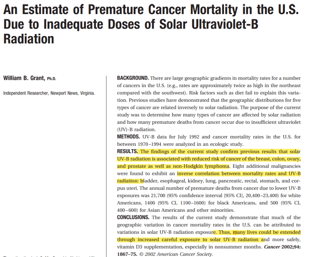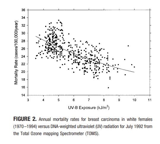 Relating to other cancers, data has shown an inverse correlation between UV-B exposure and several types of cancer. In other words, UV-B exposure had a protective effect on cancer.
