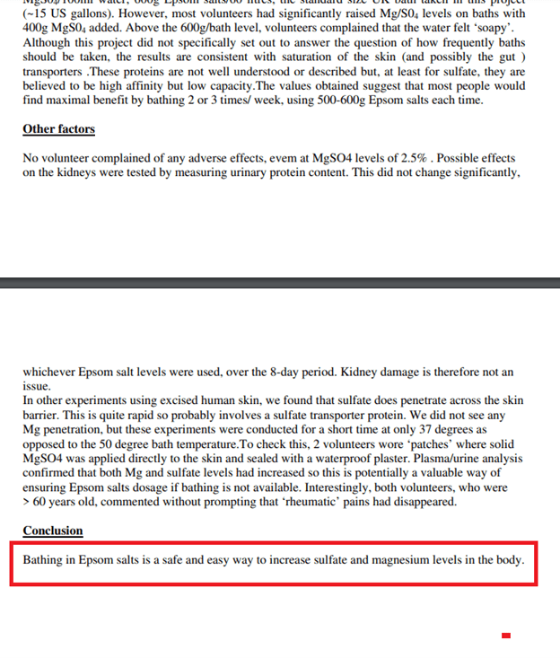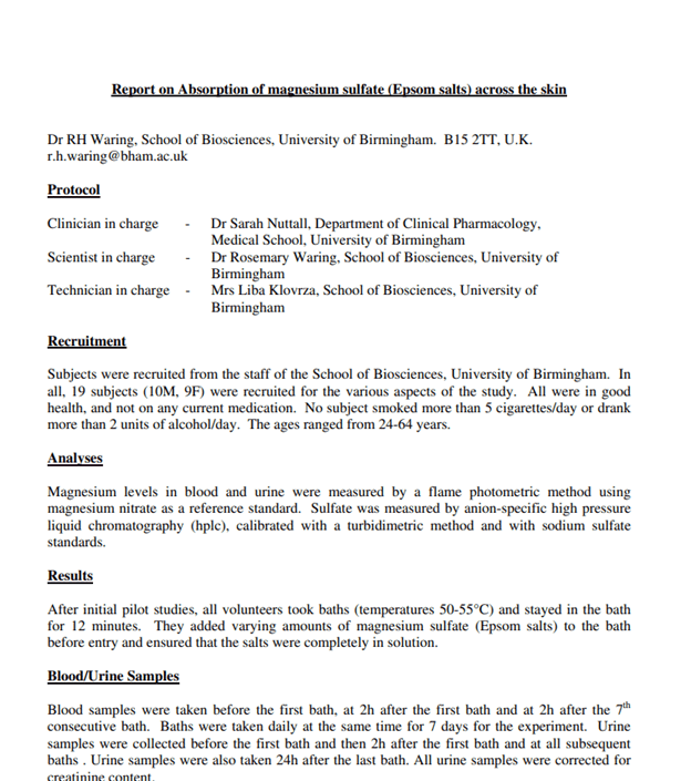A 2015 report by the Epsom Salt Council cited various studies that found evidence of magnesium absorption through the skin and its potential benefits for various health conditions, such as arthritis and fibromyalgia.
