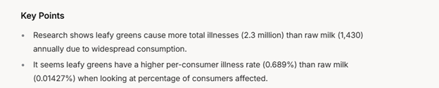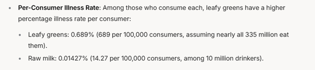 According to the data, which is taken from the CDC and research from Science Direct, consumers of leafy greens have roughly 48x better chance of getting ill from said food, then do consumers of raw milk.